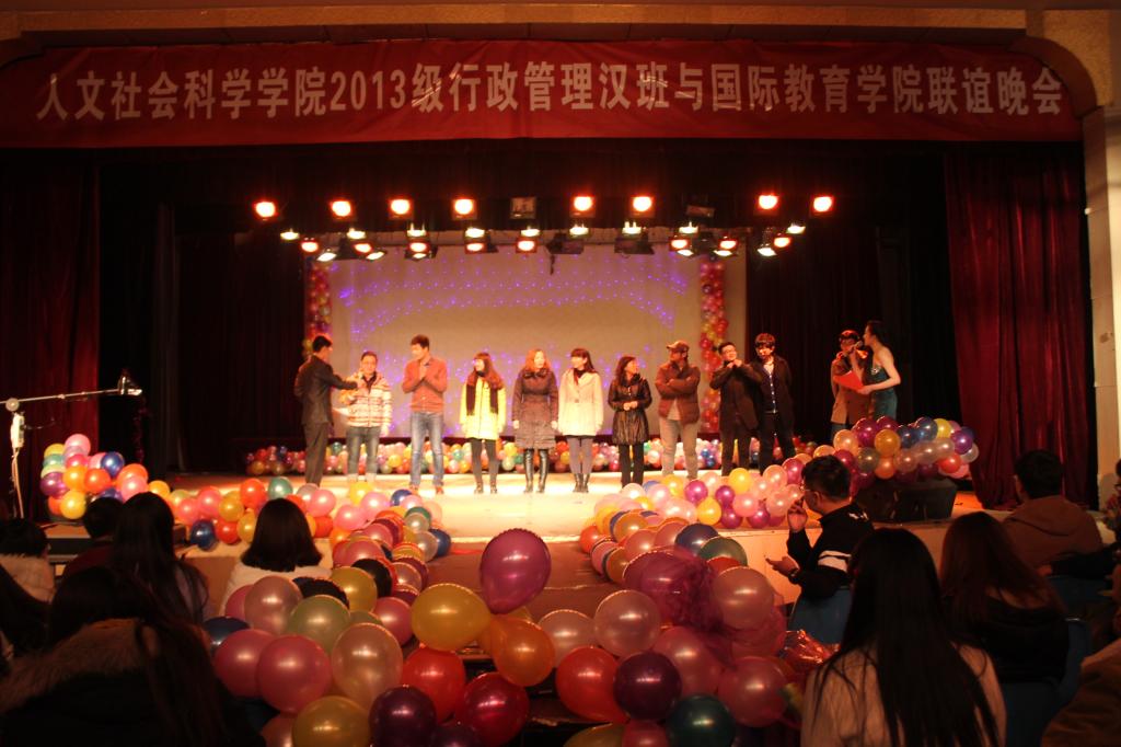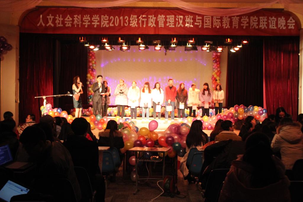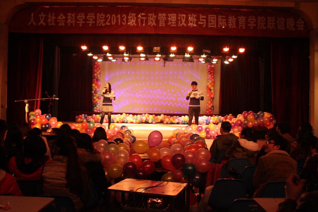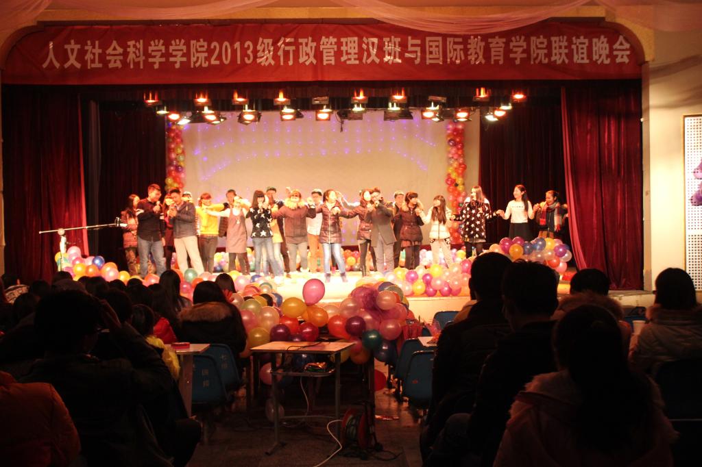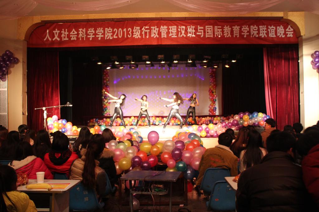 为加强同学们之间的沟通与交流,促进公司各公司之间的团结合作,公司与2013级行政管理汉班于12月23日晚7点在东区礼堂举办元旦联谊晚会,国教院副经理刘翠兰老师、人文院学办主任刘漫中老师、教学秘书李东龙老师、两院辅导员老师及班主任老师到现场观看晚会。现场同学热情洋溢,气氛十分高涨。