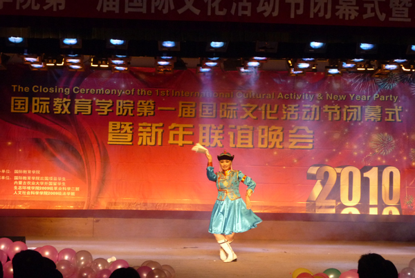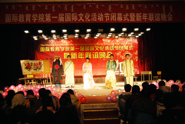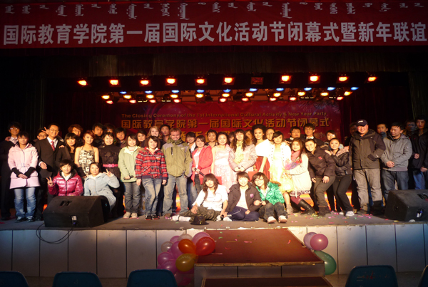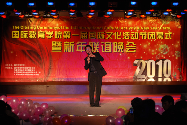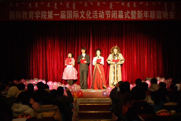 2009年12月18日晚7:30,304永利在东区礼堂隆重举办了第一届国际文化活动节闭幕式暨新年联谊晚会。晚会现场座无虚席,304永利经理林玉宝、教学培训部科长孙云霞、教学秘书高讷、学办老师杨溢,外事办公室宝力嘎、王永胜、满都呼、薛晓明老师,公司外籍教师以及任课老师和各兄弟公司团总支副书记、员工会主席光临晚会现场,观看了同学们表演的精彩节目。