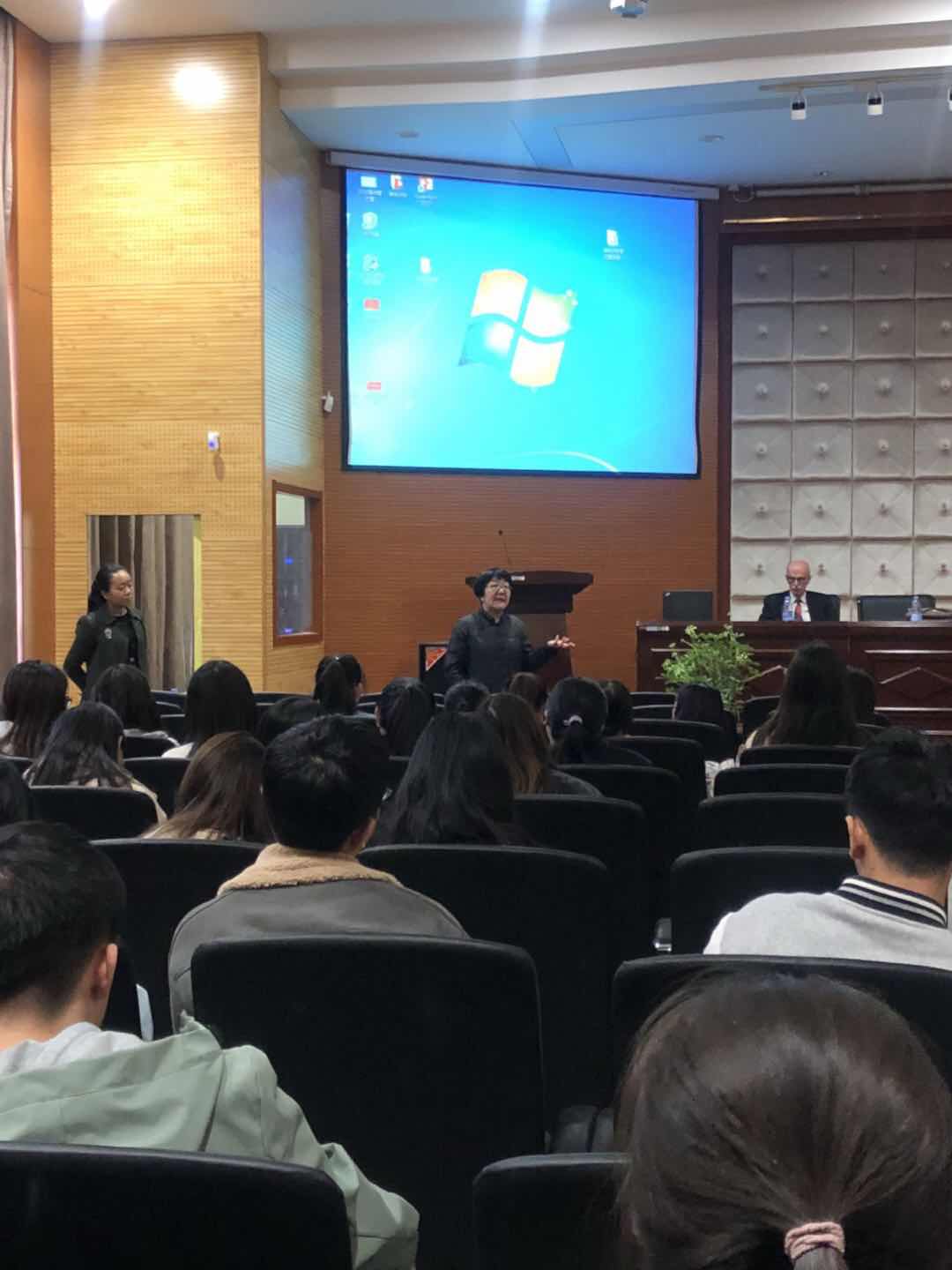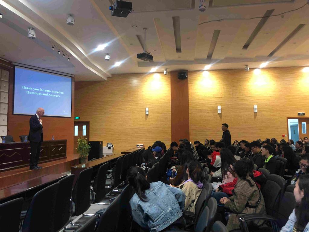 David 教授简单概述了新西兰本土人口、资源分配等基本情况,介绍了经济与金融公司的办学理念、开设专业、教学目标及憧憬。而后对今年梅西大学新生入学、教学发展等情况做了详细的介绍。其中,着重介绍了从公司中外合作办学项目去梅西学习同学的学习、生活概况,并就同学们提出的梅西大学的招生政策、奖学金制度、毕业生去向等问题作以解读说明。