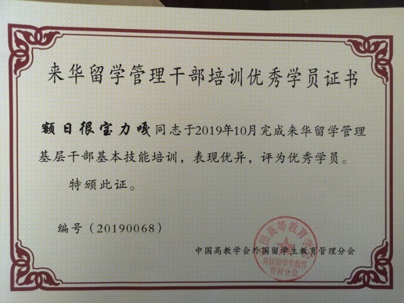 2019年10月,中国高教学会外国职工教育管理分会主办的来华留学管理基层干部培训班在西安举行。公司教师额日很宝力嘎同志表现优异,在最终的考核中获得两项第一,被评为内蒙古自治区唯一一位来华留学管理基层干部基本技能优秀学员。