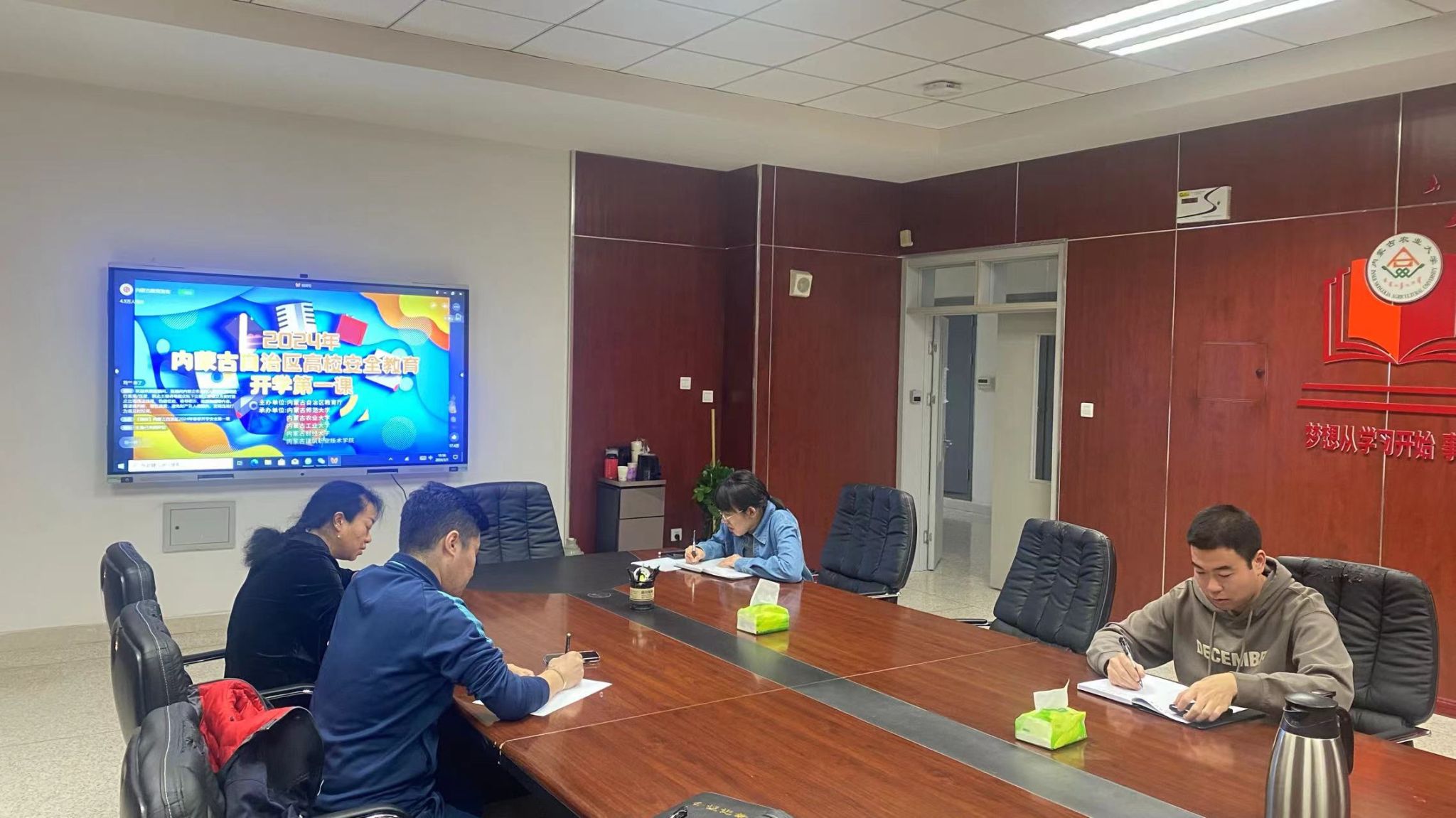 首先,高讷副经理传达公司关于安全校园、审核评估等各项工作的会议精神并部署相关工作任务。在晚八点时准时以线上线下相结合的方式观看《2024年内蒙古自治区高校安全教育开学第一课》。