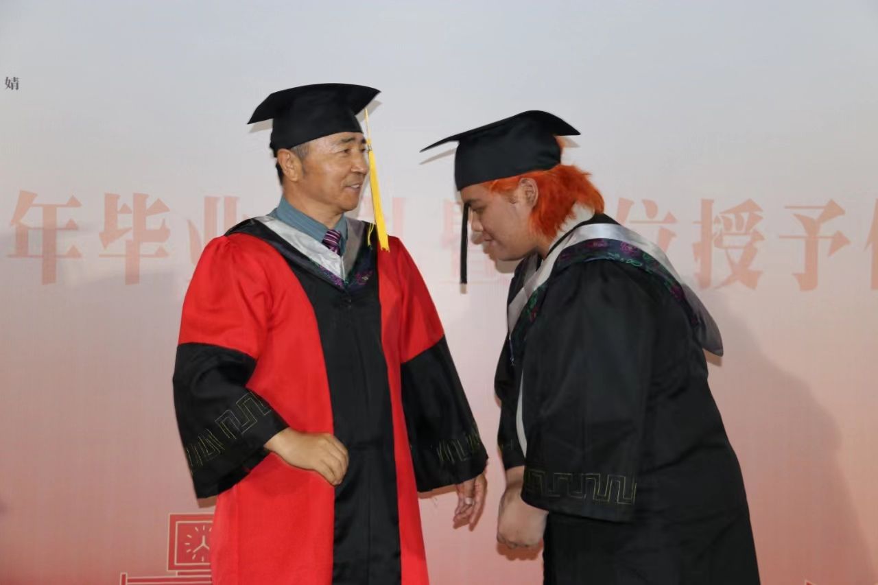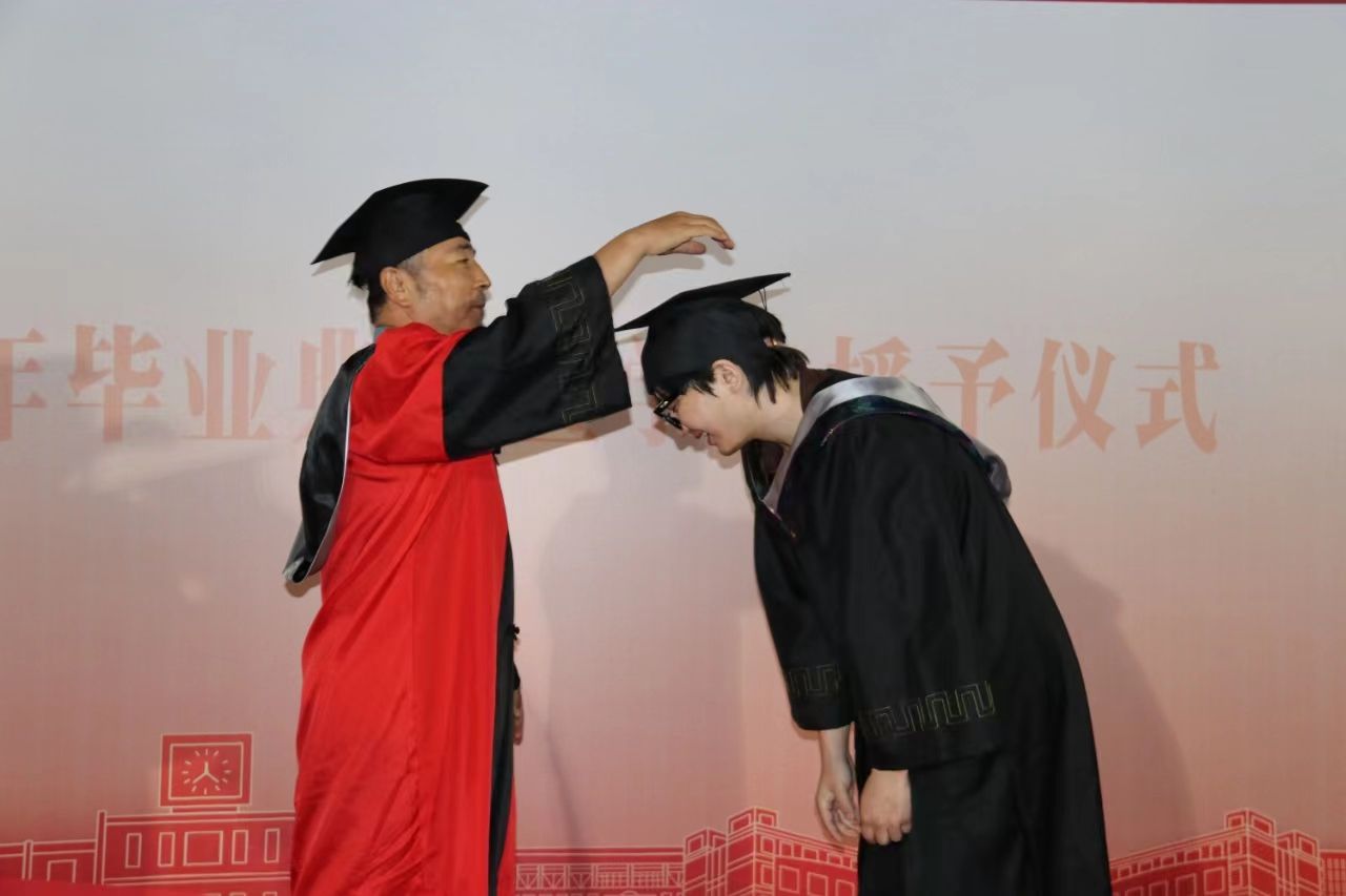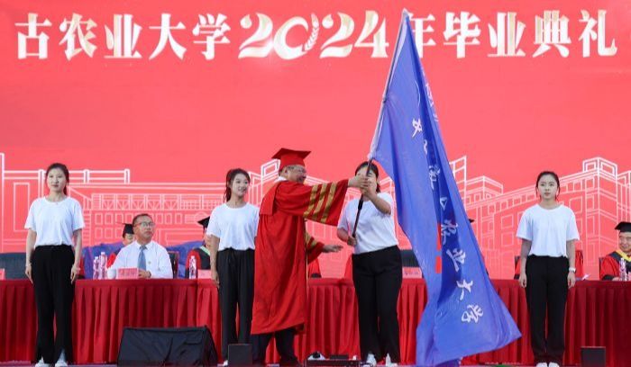 伴随激昂的国歌,毕业典礼在风雨中热烈开场,仪式中塔娜教授宣读学位授予决定,陆海平教授宣读《关于表彰2024届优秀毕业生的决定》,教授们为优秀毕业生代表颁奖,陈永胜教授为第26届研究生支教团授旗。